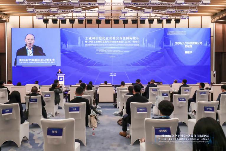 九九久科技作为碳达峰、碳中和双碳大形势下转型升级、绿色发展的代表企业,被省工信厅选中参加国家工信部在第四届进博会上主办的工业和信息化企业社会责任国际论坛暨《中国工业和信息化可持续发展报告(2021)》发布会。