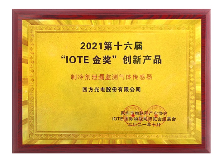 2021年10月,由中国物联网产业应用联盟、深圳市物联网产业协会主办的IOTE2021第十六届深圳国际物联网博览会上,四方光电自主研发的制冷剂泄漏监测气体传感器从上万件产品中脱颖而出,被评为IOTE2021金奖创新产品。