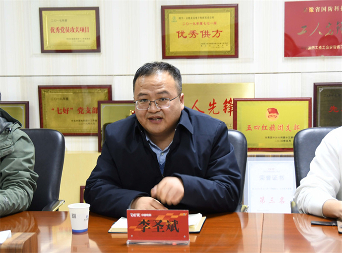 首先圣达科技党总支书记李圣斌代表公司对合工大师生一行人的到来表示欢迎,并指出本年度已是“圣达助学金”成立以来的第六年,公司不仅仅通过助学金在物质上资助学生,还提供了实习岗位,在专业知识、职场行为等方面培养学生,是圣达科技作为国有企业履行社会责任的重要实践活动。公司有意愿设立勤工助学岗位,不仅在生活上对受捐助的同学提供进一步的帮助,而且还能让他们获得专业知识和工作经验。历年来圣达科技诸多骨干技术和管理人员均毕业于合工大,学生普遍素质较高,公司欢迎更多工大的毕业生来圣达就业。