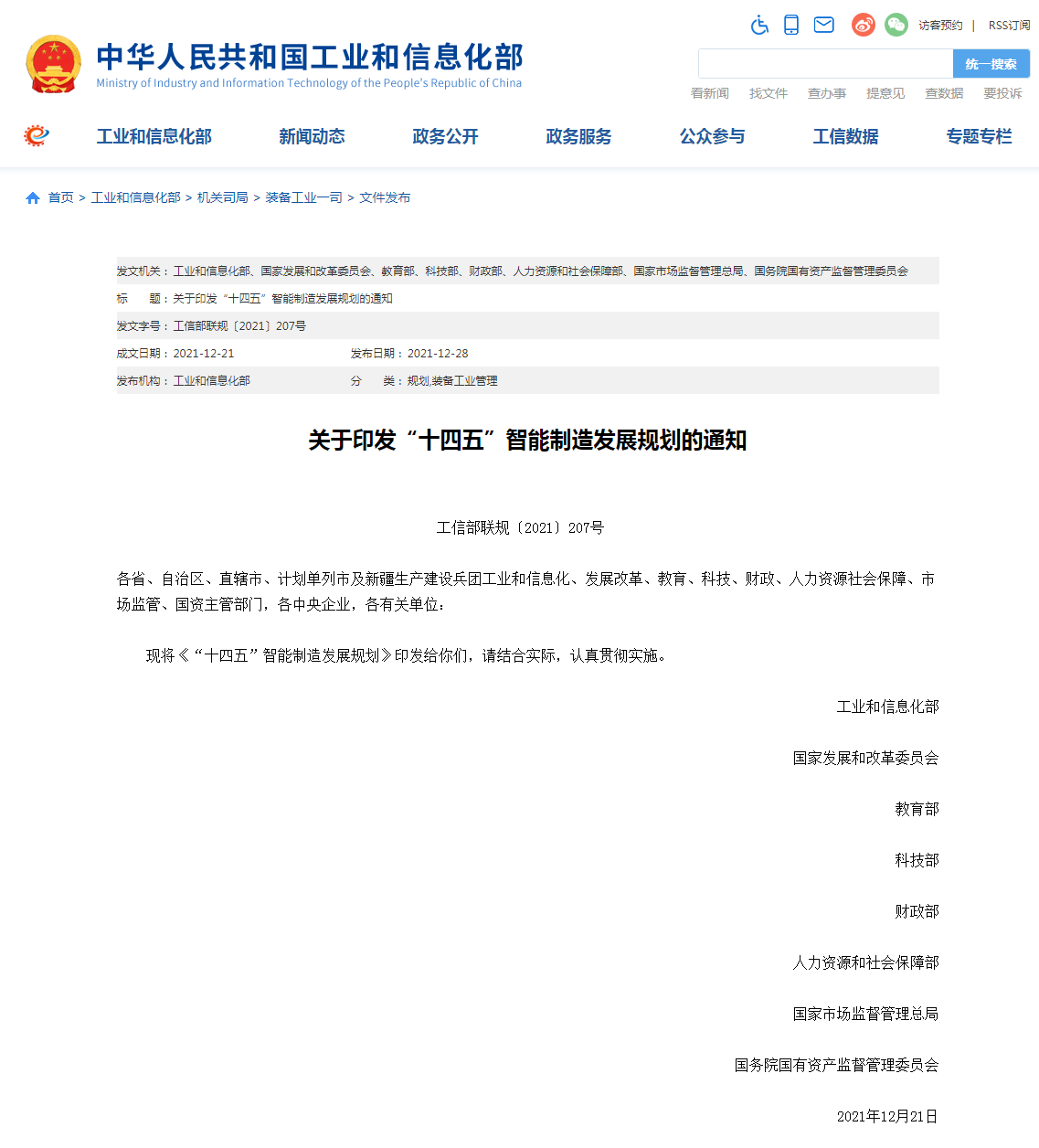 作为制造强国建设的主攻方向,智能制造发展水平关乎我国未来制造业的全球地位,对于加快发展现代产业体系,巩固壮大实体经济根基,构建新发展格局意义重大。12月28日,工信部、国家发改委、教育部、科技部等8个部门正式印发《“十四五”智能制造发展规划》(以下简称《规划》)。