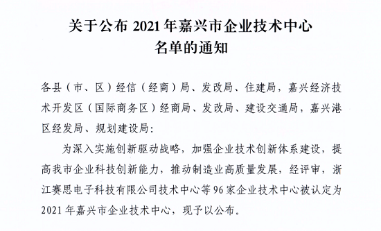 近日,经过前期评审,浙江赛思企业技术中心被认定为嘉兴市企业技术中心。赛思科技创新硬实力再获市领导专家认可。