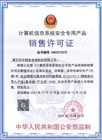 黄石华中铜业金地科技有限公司获得公安部颁发的“计算机信息系统安全专用产品”销售许可证。
