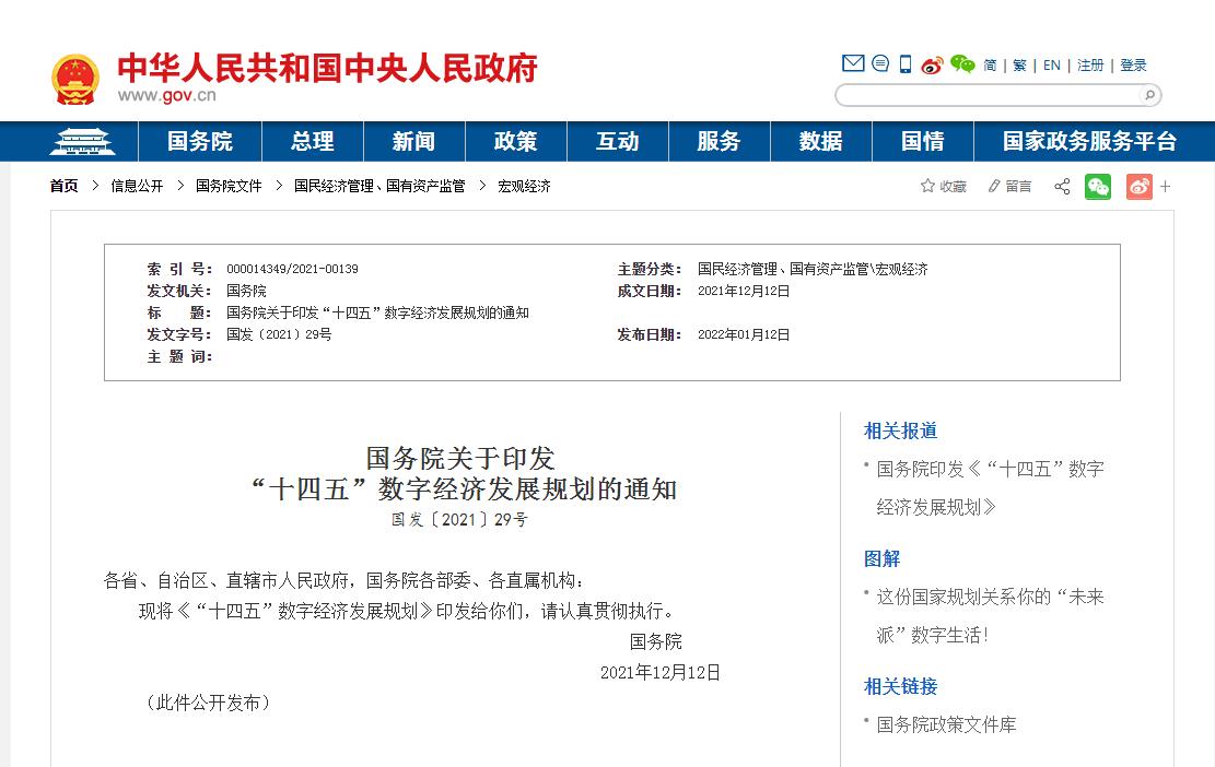 国务院日前印发《“十四五”数字经济发展规划》(以下简称《规划》),明确了“十四五”时期推动数字经济健康发展的指导思想、基本原则、发展目标、重点任务和保障措施。
