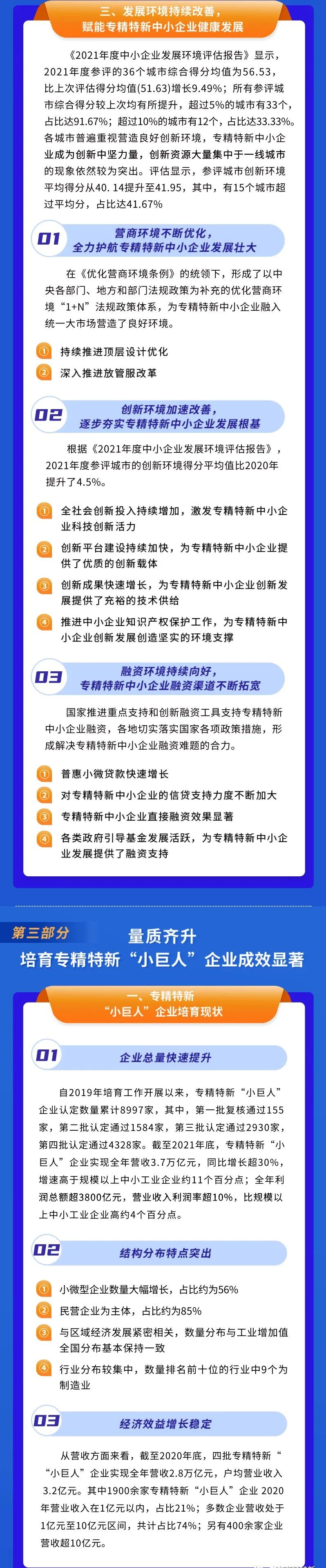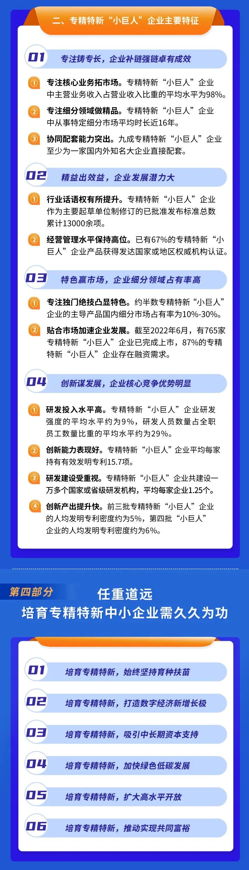 9月19日,国家工信部发布的《专精特新中小企业发展报告(2022年)》显示,第四批专精特新“小巨人”企业认定通过4328家,数量接近前三批认定通过家数之和。至此,国家级专精特新“小巨人”企业认定数量累计已达8997家。同时发布的还包括《专精特新中小企业服务产品目录(第一批)》、《大中小企业融通创新典型模式案例集(2022年)》、大中小企业融通创新服务平台、《“百场万企”大中小企业融通创新对接交流活动操作指南》,全面推进中小企业服务向更深、更广、更精方向发展。
