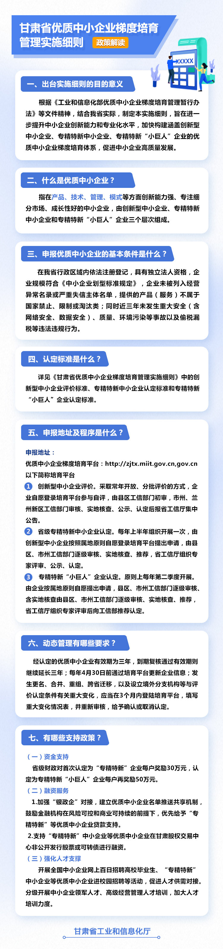省工信厅负责优质中小企业梯度培育工作的统筹协调、监督指导,推动出台相关支持政策,负责国家专精特新“小巨人”企业推荐、省级专精特新中小企业认定和创新型中小企业评价工作。各市州、兰州新区工业和信息化部门负责组织申报、审核推荐、培育服务、动态培育库建立等具体实施工作。创新型中小企业评价,原则上每季度开展一次 专精特新中小企业认定,原则上每年开展一次 专精特新“小巨人”企业推荐工作,原则上每年第二季度开展。