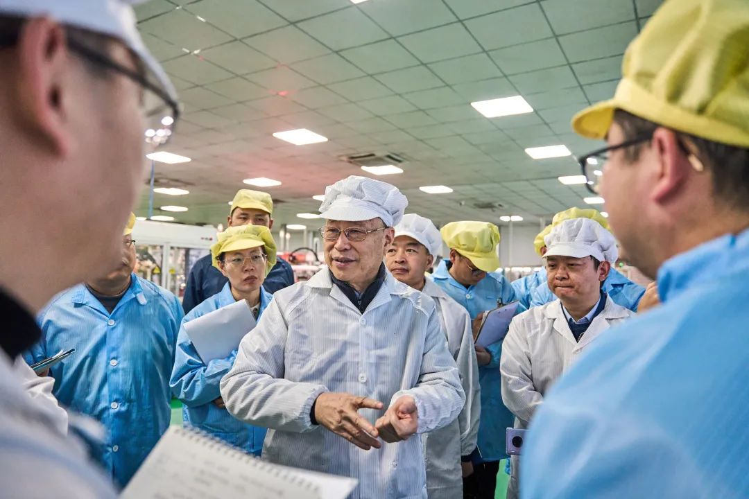 在板换车间,张道才主席、张亚波副主席听取了L博士汇报产品迭代开发的进展,通过不断的钻研深入,实现了新的创新突破。在集成组件等重要产品和生产工艺现场,各项目负责人分别汇报项目进展、客户反馈、获得经验与发展规划。张道才主席边走边看,不时驻足停步,观察生产装备的运行和系列产品的展示,与汇报人员和陪同领导交流。最后,张道才主席总结现场考察的思考,指出: