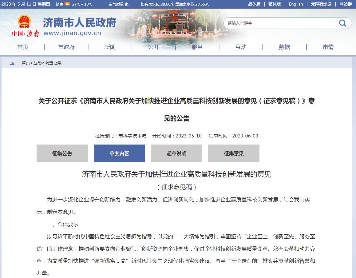 近日,济南市政府网站发布《济南市人民政府关于加快推进企业高质量科技创新发展的意见(征求意见稿)》,并向社会公开征求意见,征求意见的时间为2023年5月10日至2023年6月9日。根据《征求意见稿》,对成功创建为国家级、省级技术创新中心、产业创新中心、制造业创新中心的企业,济南拟分别给予最高500万元、100万元资金支持。对新认定的国家级科技企业孵化器且符合《济南市“十四五”科技创新规划》中我市重点产业领域的,给予最高500万元财政补助资金。力争到2025年,全市科技型中小企业突破10000家,高新技术企业突破8000家。