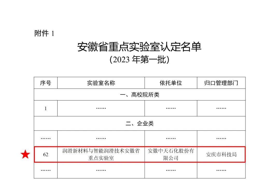 近日,安徽省科技厅公布了2023年安徽省第一批重点实验室名单,中天石化申报的润滑新材料与智能润滑技术安徽省重点实验室荣耀上榜!