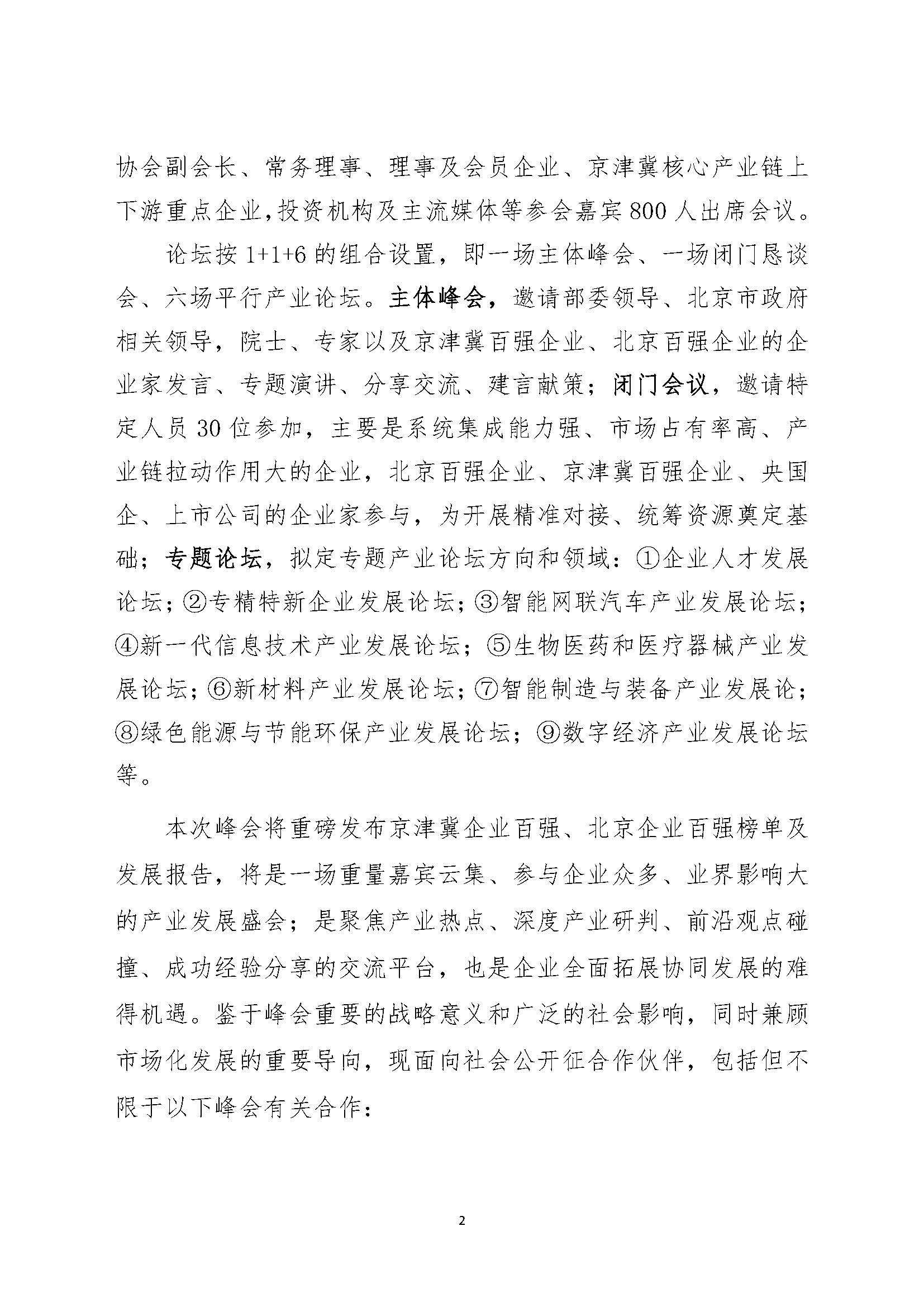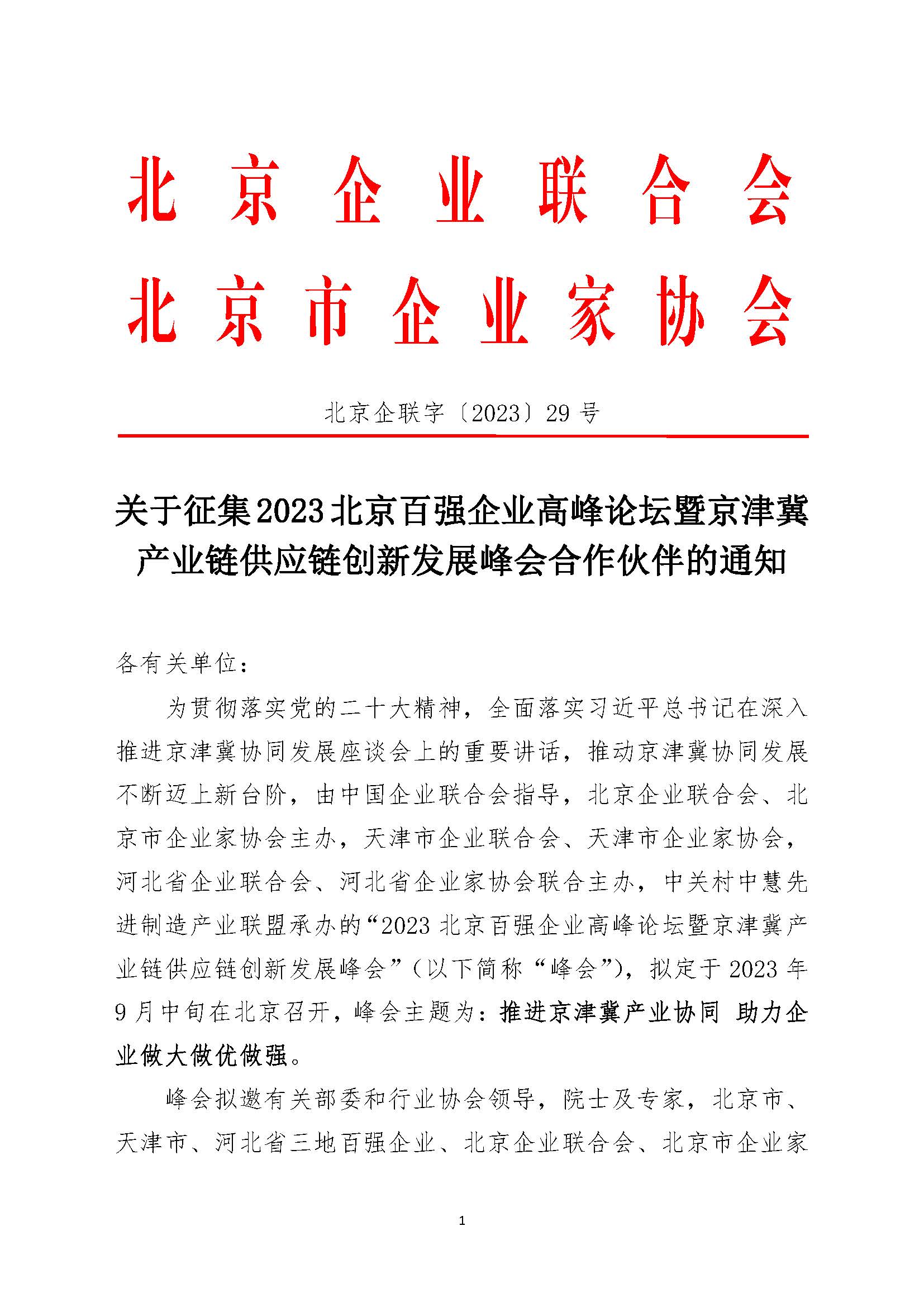 为贯彻落实党的二十大精神,全面落实习近平总书记在深入推进京津冀协同发展座谈会上的重要讲话,推动京津冀协同发展不断迈上新台阶,由中国企业联合会指导,北京企业联合会、北京市企业家协会主办,天津市企业联合会、天津市企业家协会,河北省企业联合会、河北省企业家协会联合主办,中关村中慧先进制造产业联盟承办的“2023 北京百强企业高峰论坛暨京津冀产业链供应链创新发展峰会”(以下简称“峰会”),拟定于2023 年9 月中旬在北京召开,峰会主题为:推进京津冀产业协同助力企业做大做优做强。