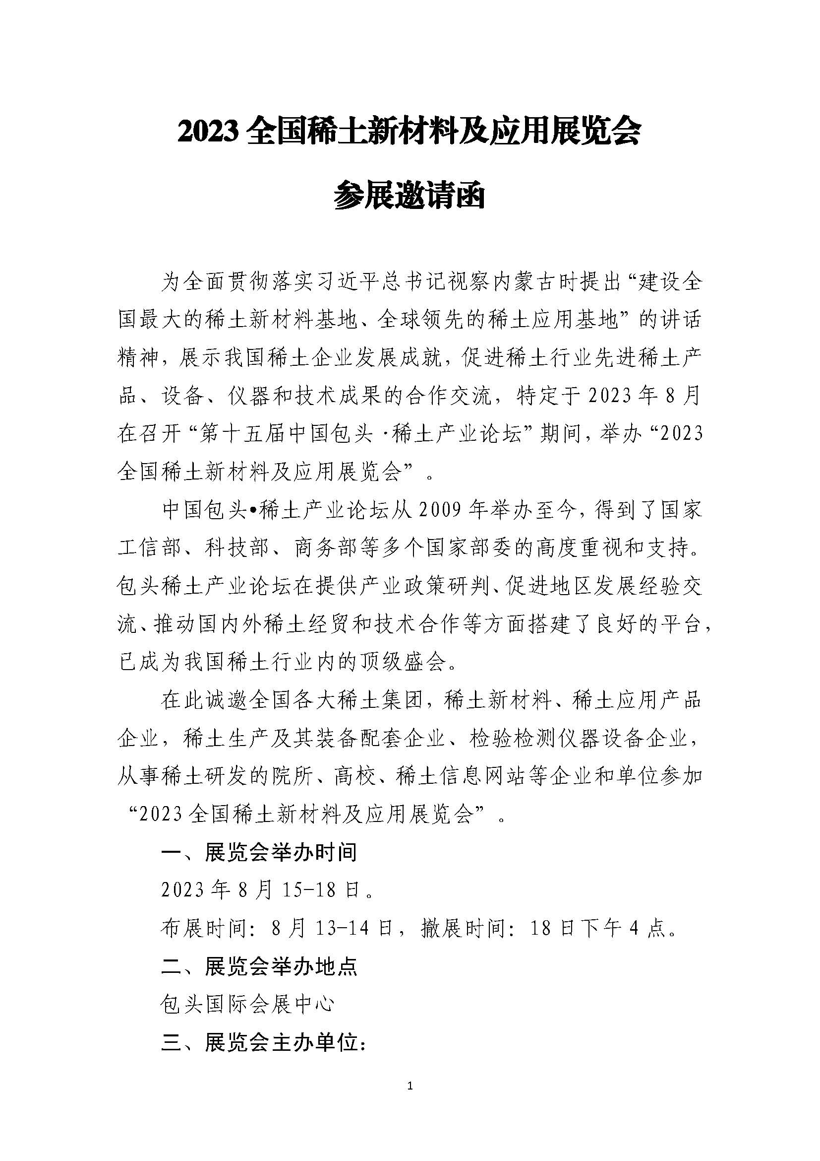 为全面贯彻落实习近平总书记视察内蒙古时提出“建设全国最大的稀土新材料基地、全球领先的稀土应用基地”的讲话精神,展示我国稀土企业发展成就,促进稀土行业先进稀土产品、设备、仪器和技术成果的合作交流,特定于2023 年8 月在召开“第十五届中国包头·稀土产业论坛”期间,举办“2023全国稀土新材料及应用展览会”。