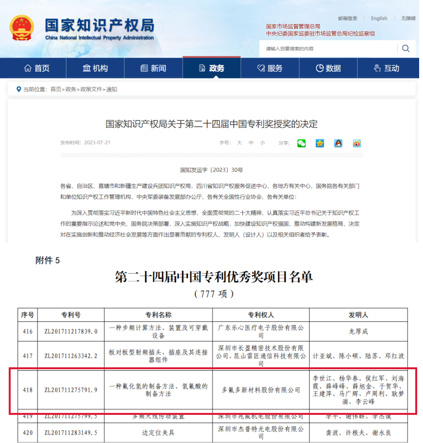 7月21日,国家知识产权局公布《国家知识产权局关于第二十四届中国专利奖授奖的决定》(国知发运字〔2023〕30号),公司发明专利《一种氟化氢的制备方法、氢氟酸的制备方法》(专利号:ZL201711275791.9)荣获第二十四届中国专利优秀奖,这是多氟多继2011年和2018年之后,第三次荣获此项国家级荣誉,同时也是公司知识产权工作布局、保护、运用、管理等方面持续发力,全力推进高质量专利建设的成果。