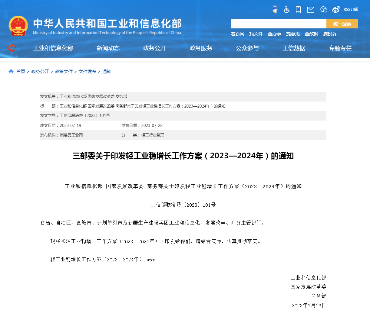 7月28日从工业和信息化部举行的新闻发布会上获悉,近日工业和信息化部、国家发展改革委、商务部联合发布《轻工业稳增长工作方案(2023—2024年)》,提出将通过一批重点举措,巩固拓展轻工业稳增长良好态势,力争明年底前,规模以上轻工企业营业收入规模突破25万亿元。