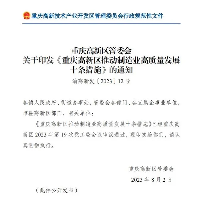 重庆高新区管委会印发《重庆高新区推动制造业高质量发展十条措施》。