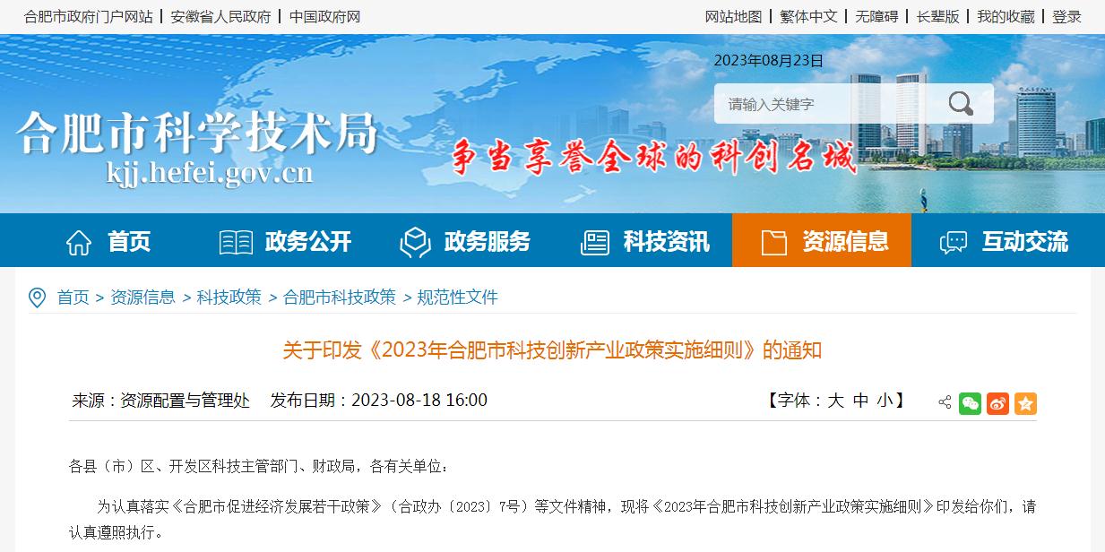 8月22日,从合肥市科技局获悉,《2023年合肥市科技创新产业政策实施细则》已于近日发布。针对研发机构建设、研发投入、科技成果转化等科技创新发展的关键环节,此次政策提出一系列“真金白银”支持。