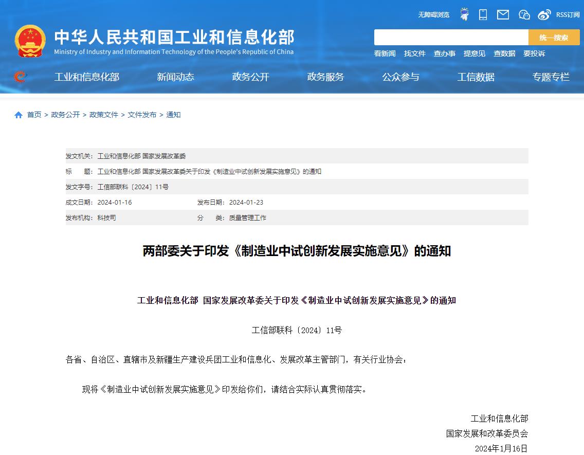 1月23日,工业和信息化部、国家发展改革委联合印发《制造业中试创新发展实施意见》(以下简称《意见》)。