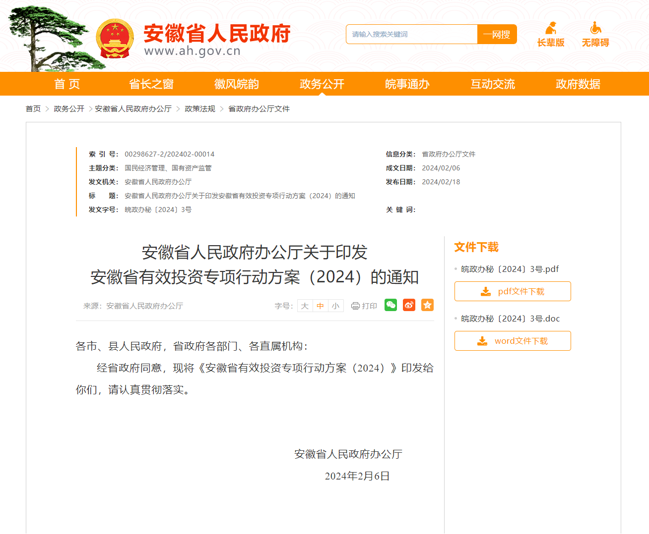 安徽省政府办公厅近日印发《安徽省有效投资专项行动方案(2024)》,将聚焦重点领域深入实施有效投资专项行动,力争2024年全省固定资产投资增长7%左右。据了解,专项行动将突出重点领域,实施科技强省、制造强省、农业强省等12个投资专项行动,稳住投资基本盘。
