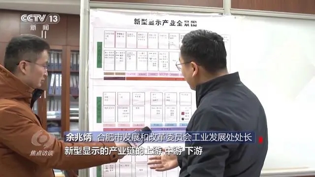 合肥市发展和改革委员会工业发展处处长 余兆炳:新型显示产业全景图上面显示了合肥市发展新型显示的产业链的上游、中游、下游本地的优势企业和龙头企业。有这个全景图其实是我们对标作战、挂图作战、非常可视化的作战。