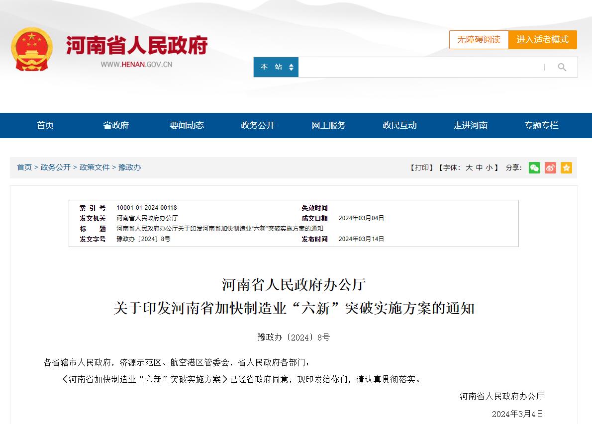 近日,河南省人民政府办公厅印发《河南省加快制造业“六新”突破实施方案》的通知。