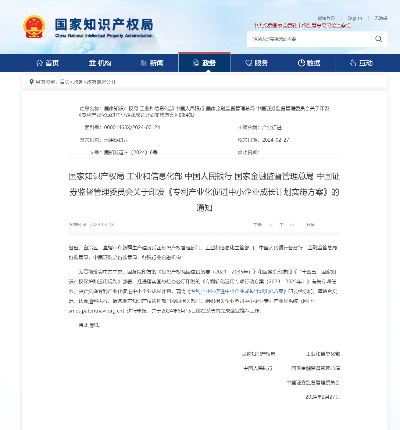 国家知识产权局3月18日消息,近日,国家知识产权局与工业和信息化部、中国人民银行、金融监管总局、中国证监会联合印发《专利产业化促进中小企业成长计划实施方案》,聚焦以专利产业化促进中小企业成长,加快推动专利技术转化为现实生产力。