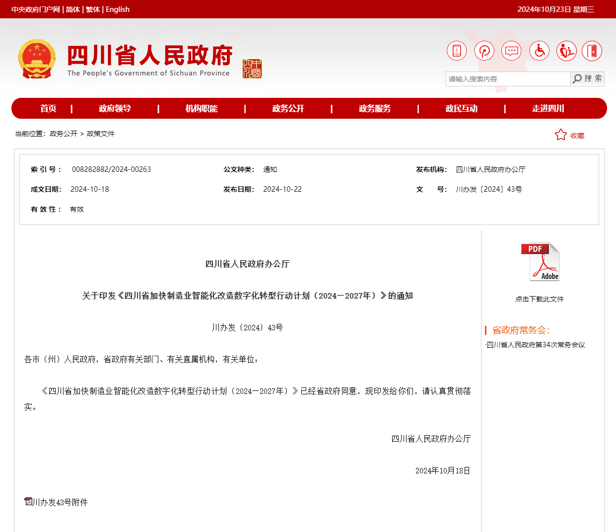 四川省政府办公厅印发《四川省加快制造业智能化改造数字化转型行动计划(2024—2027年)》
