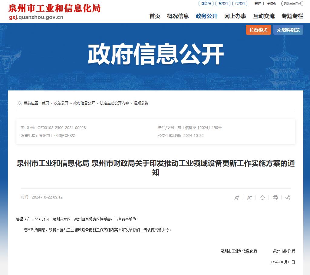 为贯彻落实党中央、国务院和省委省政府决策部署,根据《工业和信息化部等七部门关于印发推动工业领域设备更新实施方案的通知》等政策要求,近日,泉州市工信局、市财政局结合泉州实际,联合出台了《推动工业领域设备更新工作实施方案》(以下简称《实施方案》)。