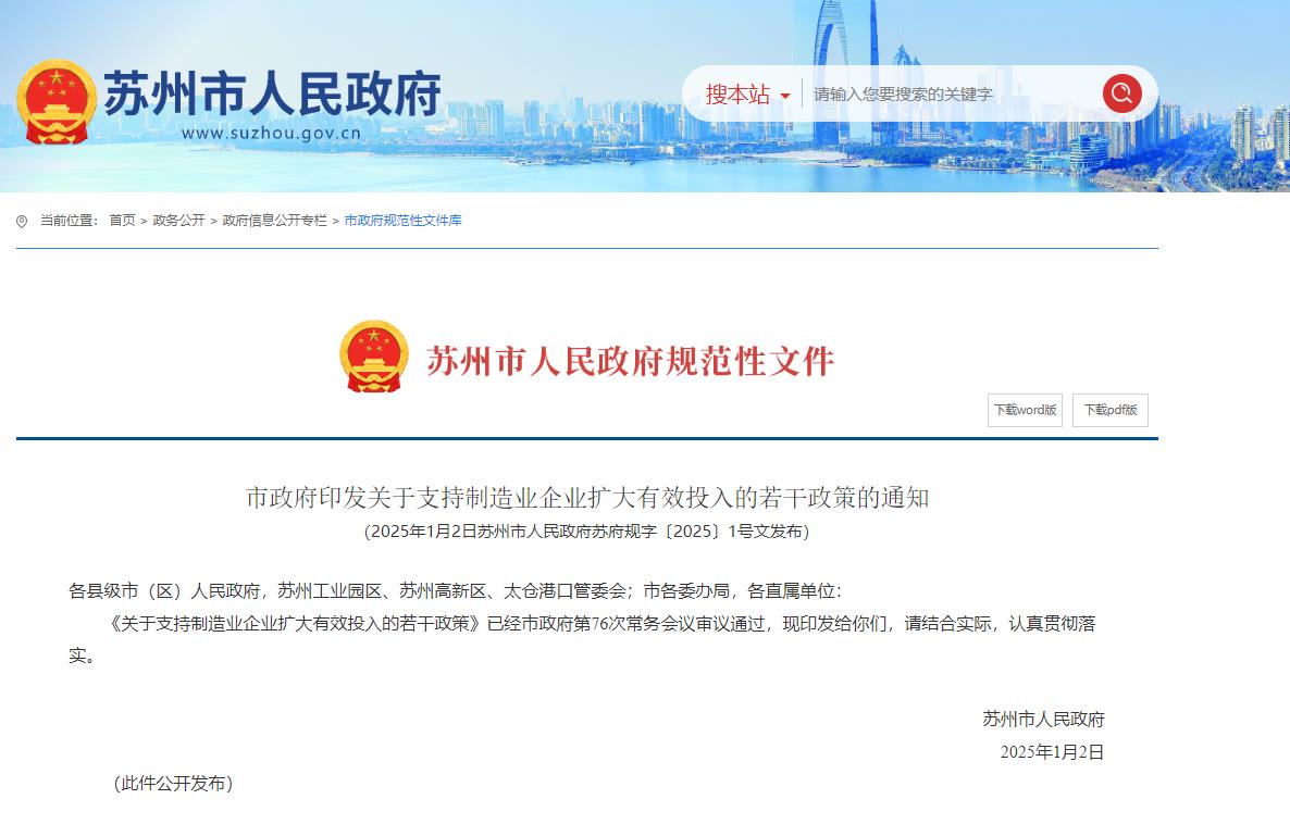 1月8日,苏州市人民政府发布《关于支持制造业企业扩大有效投入的若干政策》,目标到2027年,苏州市工业领域设备投资规模达1100亿元,技术改造投资达1300亿元,每年推动1000家以上工业企业设备更新改造,每年实施总投资1000万元以上增资扩产项目超1000个,新增百亿级工业项目10个以上,完成3万亩低效工业用地转型,推动苏州市工业投资年均两位数增长。