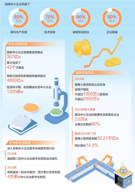 支持中小企业聚焦主业、精耕细作,以科技创新引领新质生产力发展。2024年6月,财政部、工业和信息化部印发《关于进一步支持专精特新中小企业高质量发展的通知》,通过中央财政支持1000多家重点“小巨人”企业打造新动能、攻坚新技术、开发新产品、强化产业链的配套能力。2024年4月,中国人民银行联合科技部等部门设立5000亿元科技创新和技术改造再贷款,其中1000亿元额度用于支持初创期、成长期科技型中小企业首次贷款。