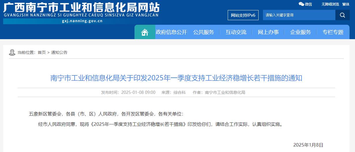 近日,南宁市工业和信息化局印发《2025年一季度支持工业经济稳增长若干措施》(以下简称《若干措施》),从鼓励企业节假日期间稳岗稳产、支持企业稳产增效、加快制造业项目建设、深化企业数实融合、加强企业融资支持、助力企业开拓市场、推动设备更新和技术改造、提升服务企业效能等8个方面推出一系列激励措施,力争一季度“开门红”目标任务圆满完成。