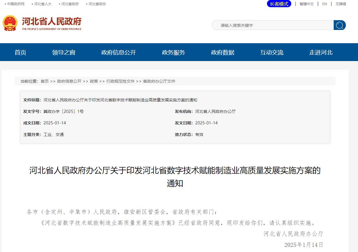 作为制造业大省,河北如何以数字技术赋能制造业高质量发展?1月14日,河北省政府办公厅印发《河北省数字技术赋能制造业高质量发展实施方案》提出,以大模型在制造业领域规模化应用为牵引,点、线、面一体化推进制造业数字化、网络化、智能化转型。