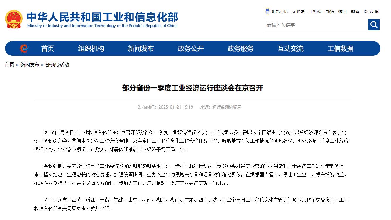 2025年1月20日,工业和信息化部在北京召开部分省份一季度工业经济运行座谈会。部党组成员、副部长辛国斌主持会议,部总经济师高东升参加会议。会议深入学习贯彻中央经济工作会议精神,落实全国工业和信息化工作会议任务安排,听取地方有关工作情况和意见建议,研究分析一季度工业经济运行态势、企业春节期间生产形势,部署做好推动工业经济平稳开局工作。