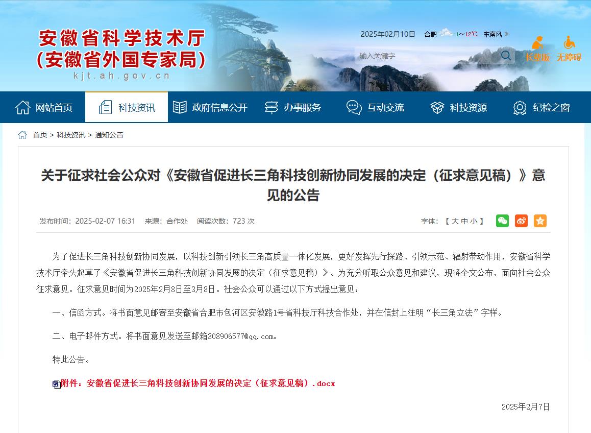 为促进长三角科技创新协同发展,更好发挥先行探路、引领示范、辐射带动作用,近日,安徽省科学技术厅牵头起草了《安徽省促进长三角科技创新协同发展的决定(征求意见稿)》,2025年2月8日至3月8日期间征求社会公众的意见。征求意见稿中提出,将与江浙沪共建国家战略科技力量、国家技术创新中心、重大科技基础设施等,协力打造原始创新高地和高精尖产业承载区,努力建成具有全球影响力的长三角科技创新共同体。