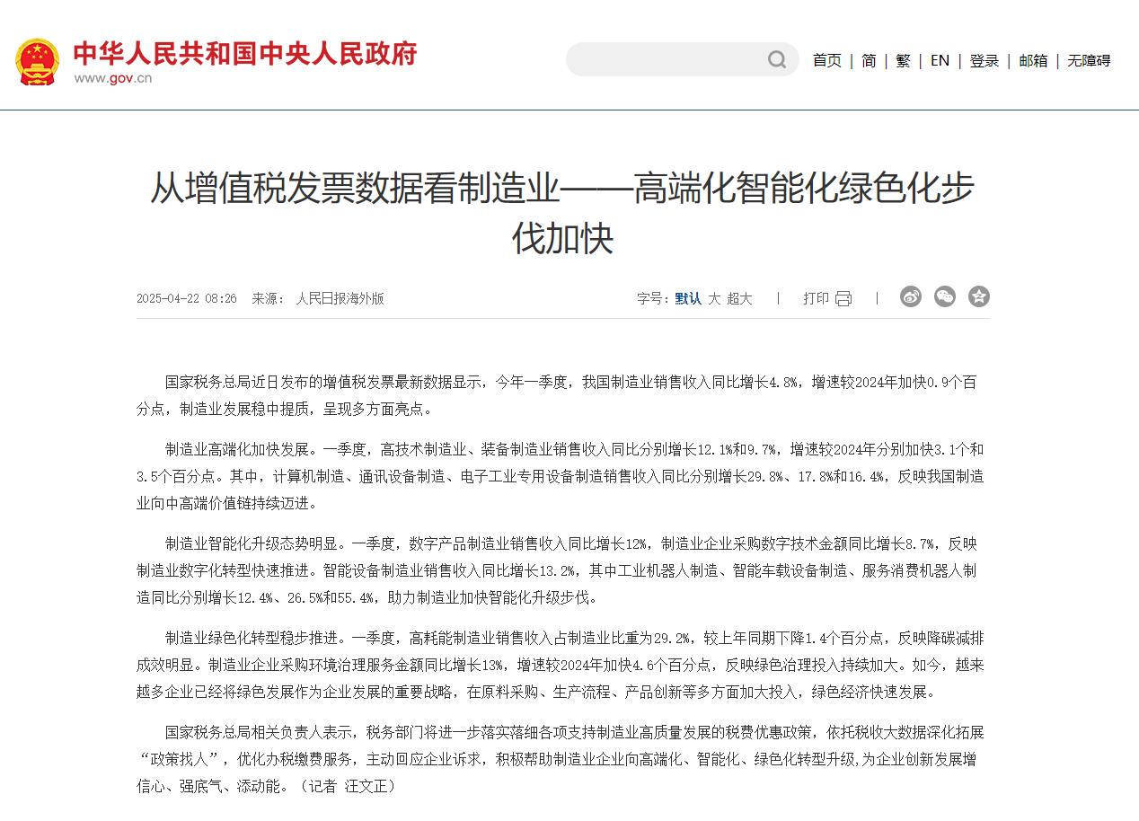 国家税务总局近日发布的增值税发票最新数据显示,今年一季度,我国制造业销售收入同比增长4.8%,增速较2024年加快0.9个百分点,制造业发展稳中提质,呈现多方面亮点。