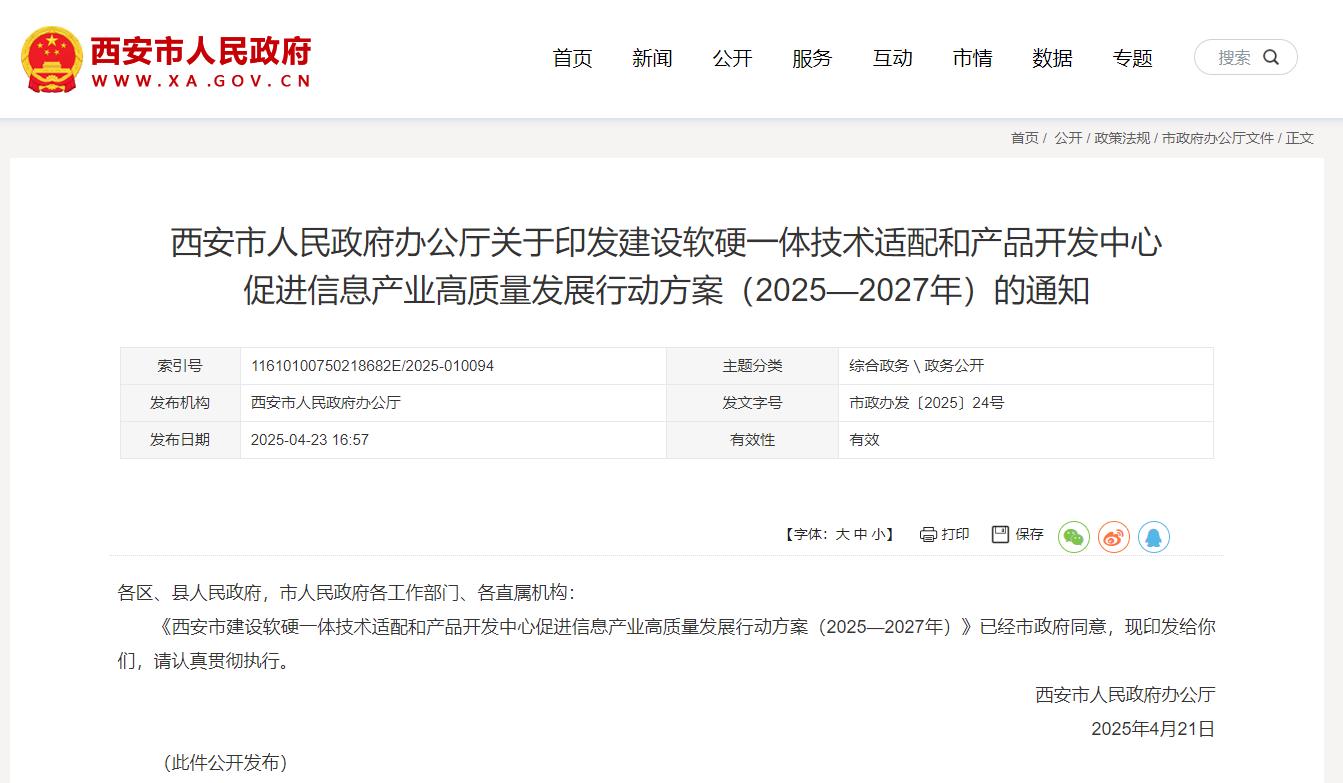 4月23日获悉,西安市政府办公厅印发《西安市建设软硬一体技术适配和产品开发中心促进信息产业高质量发展行动方案(2025—2027年)》(以下简称《行动方案》),旨在加快推进软硬一体技术适配和产品开发中心建设,重点支撑智能终端产业链培育,推动工业软件、信创、人工智能适配应用,促进信息产业高质量发展。