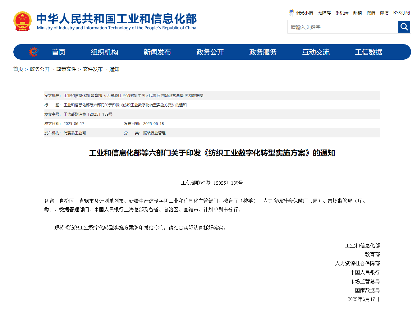 从工业和信息化部获悉,近日,工业和信息化部、教育部、人力资源社会保障部等六部门联合印发《纺织工业数字化转型实施方案》(以下简称《实施方案》),加快推动数智技术全面赋能纺织工业发展。