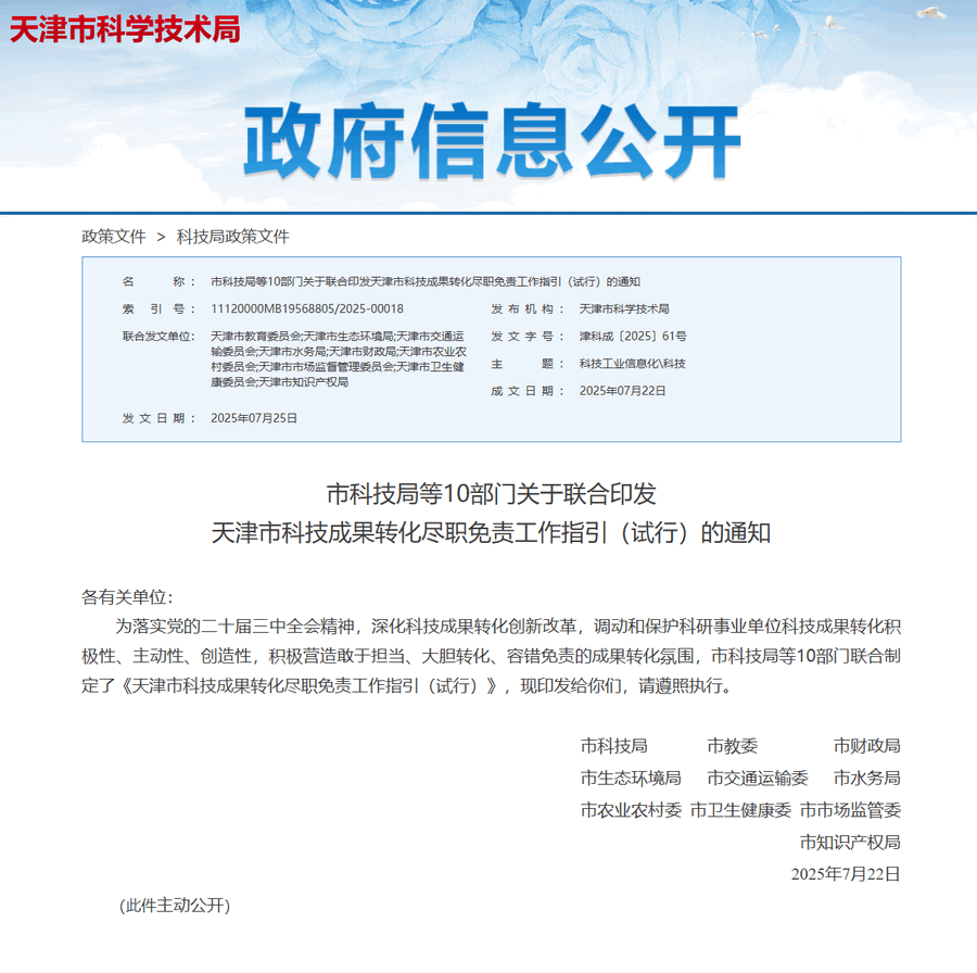 为深化科技成果转化创新改革,调动和保护科研事业单位科技成果转化积极性、主动性、创造性,积极营造敢于担当、大胆转化、容错免责的成果转化氛围,日前,天津市科技局等10部门联合制定了《天津市科技成果转化尽职免责工作指引(试行)》。