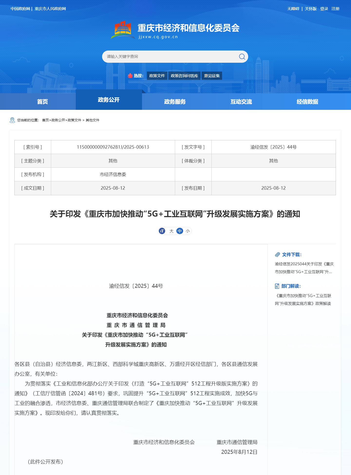 8月12日,重庆市经济信息委、市通信管理局联合印发《重庆市加快推动“5G+工业互联网”升级发展实施方案》(下称《方案》),提出围绕推动“33618”现代制造业集群高质量发展要求,丰富“5G+工业互联网”产业供给,计划到2027年,全市新增建设30个市级5G工厂。