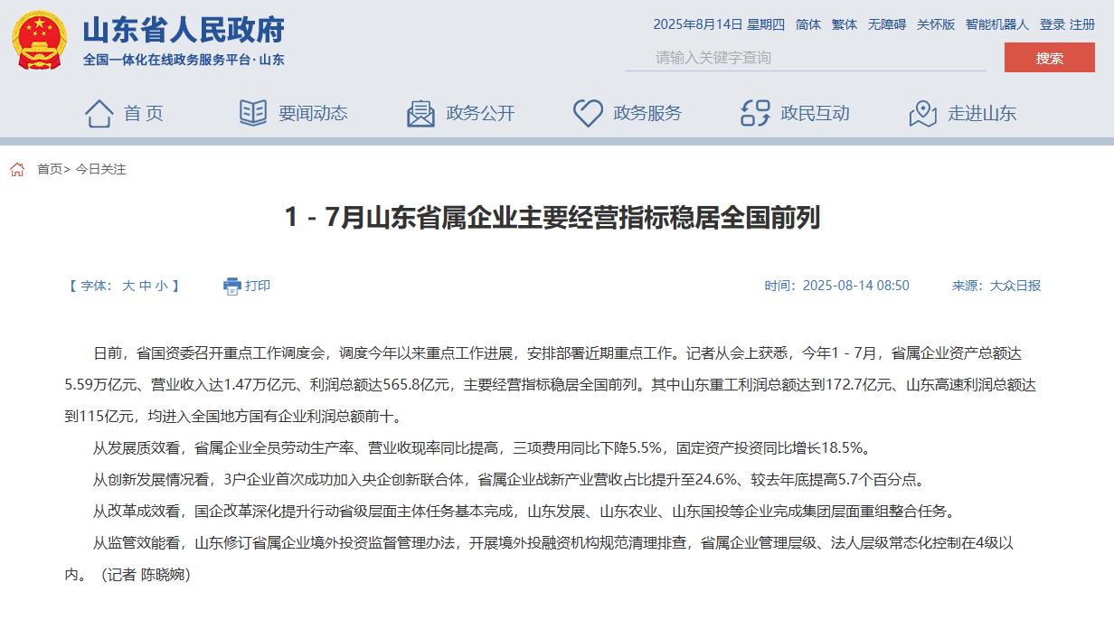 日前,山东省国资委召开重点工作调度会,调度今年以来重点工作进展,安排部署近期重点工作。记者从会上获悉,今年1-7月,省属企业资产总额达5.59万亿元、营业收入达1.47万亿元、利润总额达565.8亿元,主要经营指标稳居全国前列。其中山东重工利润总额达到172.7亿元、山东高速利润总额达到115亿元,均进入全国地方国有企业利润总额前十。