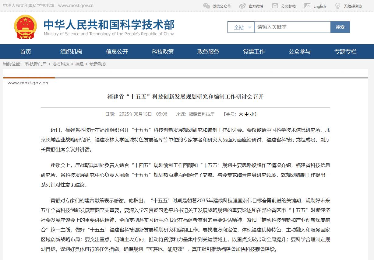 近日,福建省科技厅在福州组织召开“十五五”科技创新发展规划研究和编制工作研讨会。会议邀请中国科学技术信息研究所、北京长城企业战略研究所、福建农林大学区域特色发展智库等单位的专家学者和研究人员面对面座谈研讨。福建省科技厅党组成员、副厅长黄舒出席会议并讲话。