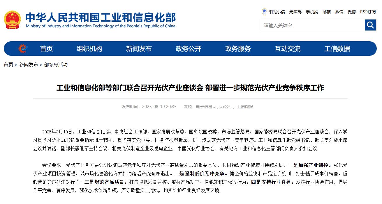 2025年8月19日,工业和信息化部、中央社会工作部、国家发展改革委、国务院国资委、市场监管总局、国家能源局联合召开光伏产业座谈会,深入学习贯彻习近平总书记重要指示批示精神,贯彻落实党中央、国务院决策部署,进一步规范光伏产业竞争秩序。工业和信息化部党组书记、部长李乐成出席会议并讲话,副部长熊继军主持会议。相关光伏制造企业及发电企业、中国光伏行业协会、有关地方工业和信息化主管部门负责人参加会议。
