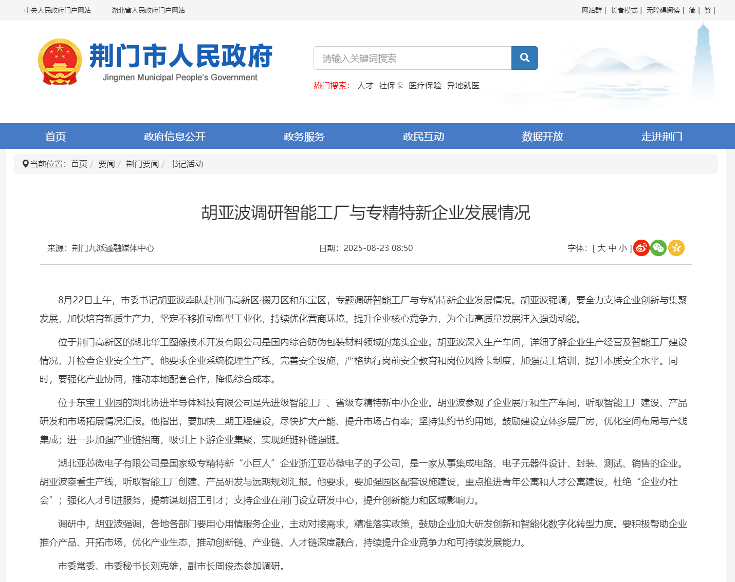 湖北亚芯微电子有限公司是国家级专精特新“小巨人”企业浙江亚芯微电子的子公司,是一家从事集成电路、电子元器件设计、封装、测试、销售的企业。胡亚波察看生产线,听取智能工厂创建、产品研发与远期规划汇报。他要求,要加强园区配套设施建设,重点推进青年公寓和人才公寓建设,杜绝“企业办社会” 强化人才引进服务,提前谋划招工引才 支持企业在荆门设立研发中心,提升创新能力和区域影响力。