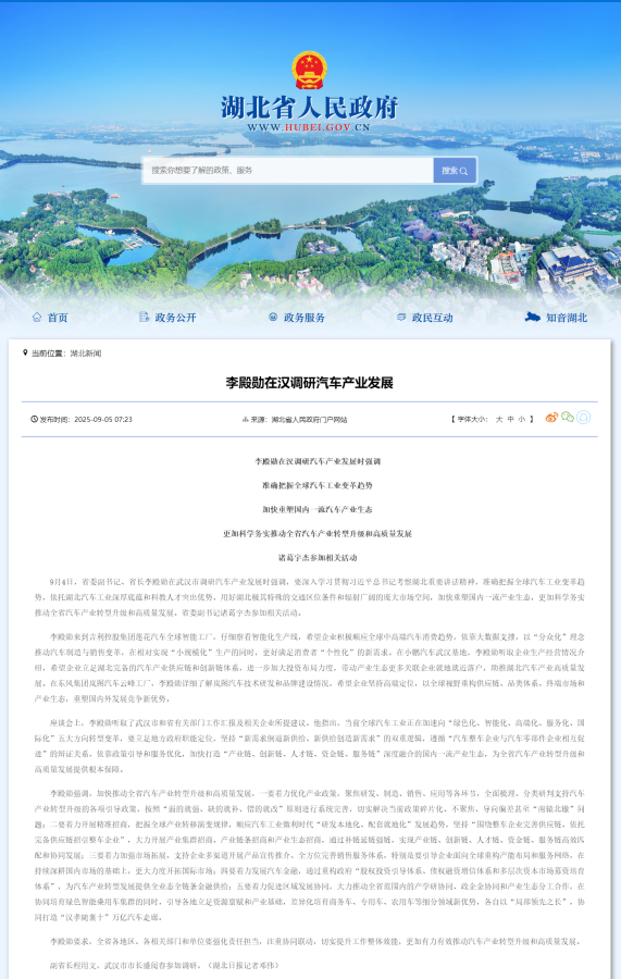 9月4日,湖北省委副书记、省长李殿勋在武汉市调研汽车产业发展时强调,要深入学习贯彻习近平总书记考察湖北重要讲话精神,准确把握全球汽车工业变革趋势,依托湖北汽车工业深厚底蕴和科教人才突出优势,用好湖北极其特殊的交通区位条件和辐射广阔的庞大市场空间,加快重塑国内一流产业生态,更加科学务实推动全省汽车产业转型升级和高质量发展。省委副书记诸葛宇杰参加相关活动。