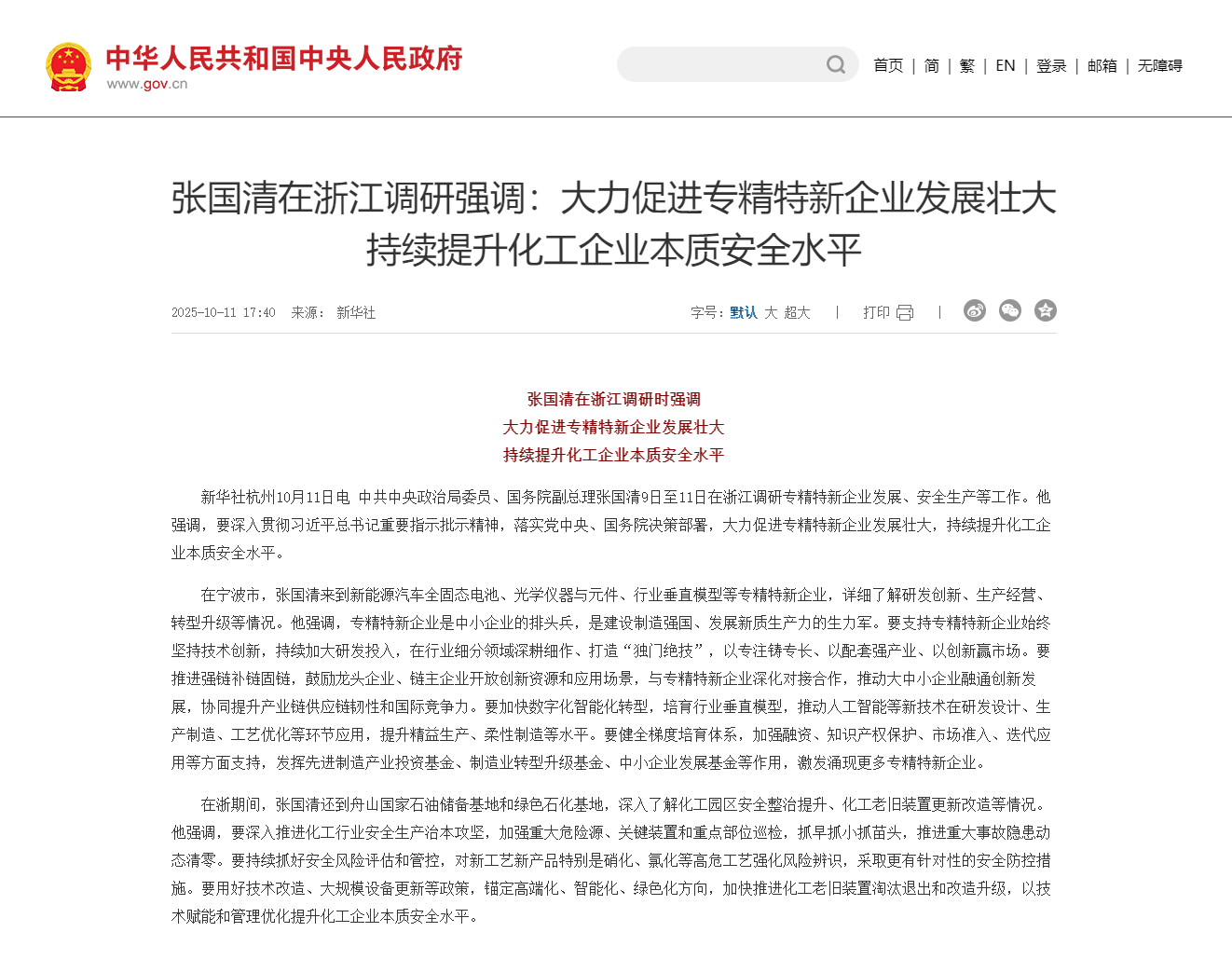 中共中央政治局委员、国务院副总理张国清9日至11日在浙江调研专精特新企业发展、安全生产等工作。他强调,要深入贯彻习近平总书记重要指示批示精神,落实党中央、国务院决策部署,大力促进专精特新企业发展壮大,持续提升化工企业本质安全水平。