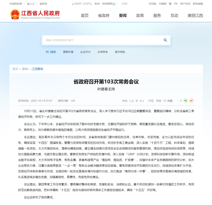 10月13日,江西省长叶建春主持召开第103次省政府常务会议,深入学习贯彻习近平总书记近期重要讲话、重要指示精神,分析全省前三季度经济形势,研究下一步工作建议。