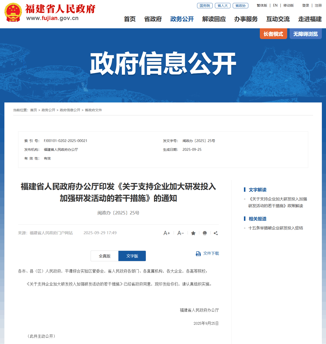 10月16日从福建省政府办公厅获悉,该省日前印发了《关于支持企业加大研发投入加强研发活动的若干措施》(以下简称《若干措施》),大力支持高研发投入企业,优先立项支持年度研发经费支出1亿元以上的企业开展重大科技攻关。