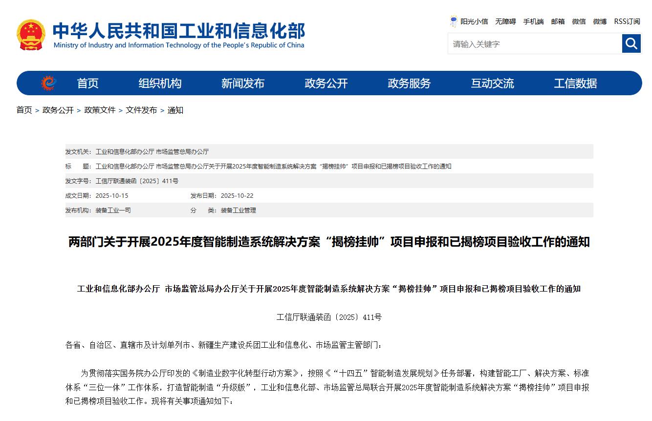 为贯彻落实国务院办公厅印发的《制造业数字化转型行动方案》,按照《“十四五”智能制造发展规划》任务部署,构建智能工厂、解决方案、标准体系“三位一体”工作体系,打造智能制造“升级版”,工业和信息化部、市场监管总局联合开展2025年度智能制造系统解决方案“揭榜挂帅”项目申报和已揭榜项目验收工作。现将有关事项通知如下: