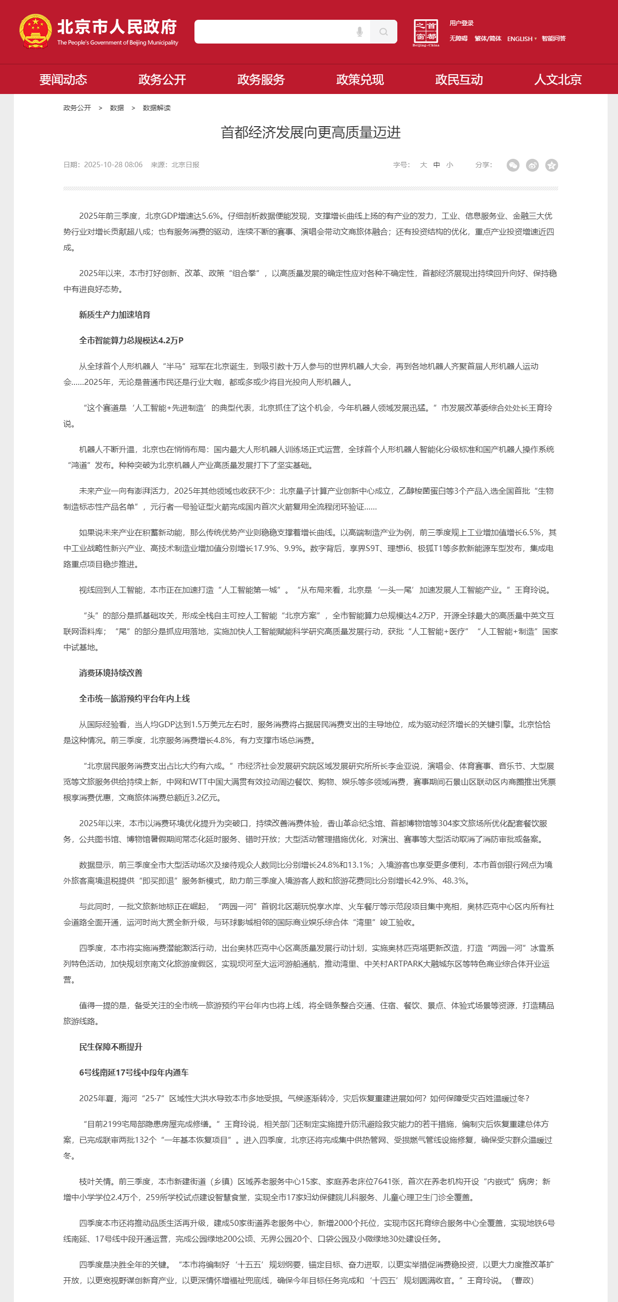 2025年前三季度,北京GDP增速达5.6%。仔细剖析数据便能发现,支撑增长曲线上扬的有产业的发力,工业、信息服务业、金融三大优势行业对增长贡献超八成 也有服务消费的驱动,连续不断的赛事、演唱会带动文商旅体融合 还有投资结构的优化,重点产业投资增速近四成。