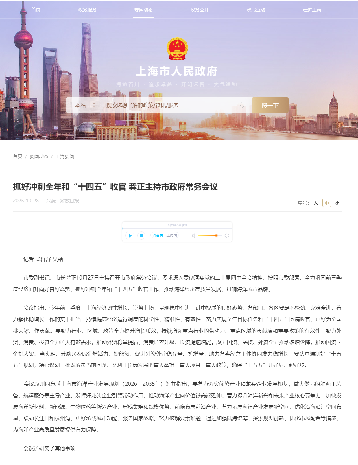 上海市委副书记、市长龚正10月27日主持召开市政府常务会议,要求深入贯彻落实党的二十届四中全会精神,按照市委部署,全力巩固前三季度经济回升向好良好态势,抓好冲刺全年和“十四五”收官工作 推动海洋经济高质量发展,打响海洋城市品牌。