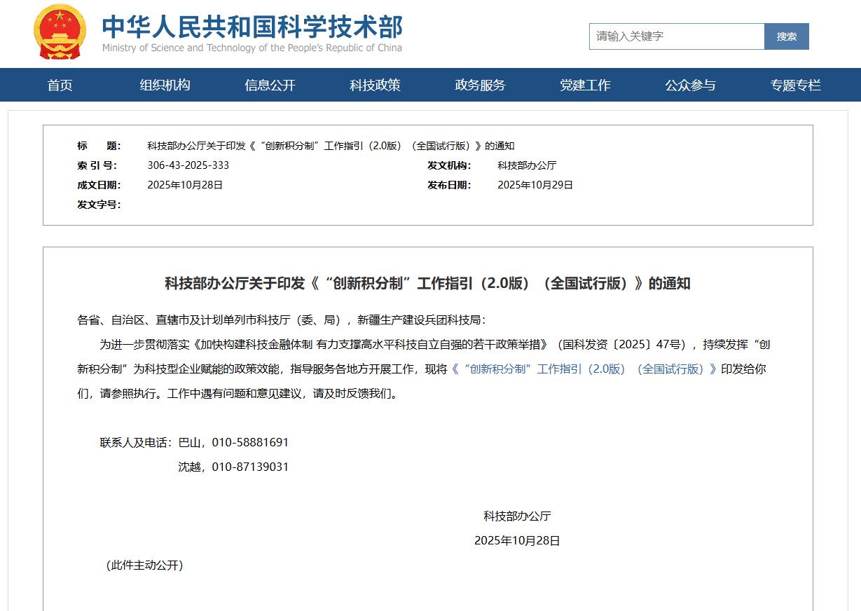 10月29日,科技部办公厅发布《关于开展创新积分制“揭榜挂帅”的通知》(以下简称《通知》)。