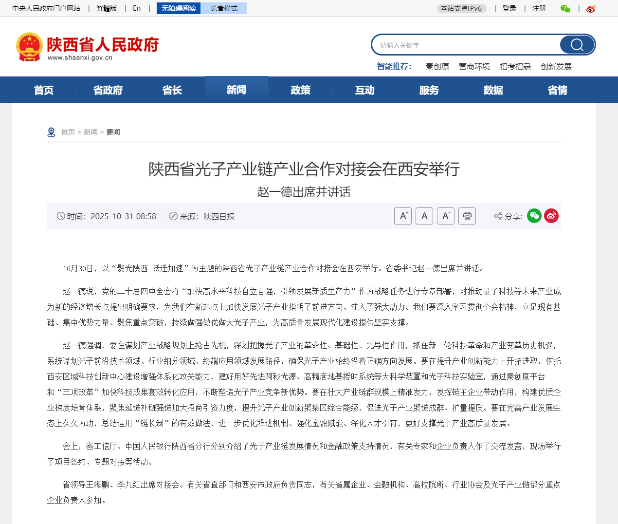 10月30日,以“聚光陕西 跃迁加速”为主题的陕西省光子产业链产业合作对接会在西安举行。省委书记赵一德出席并讲话。