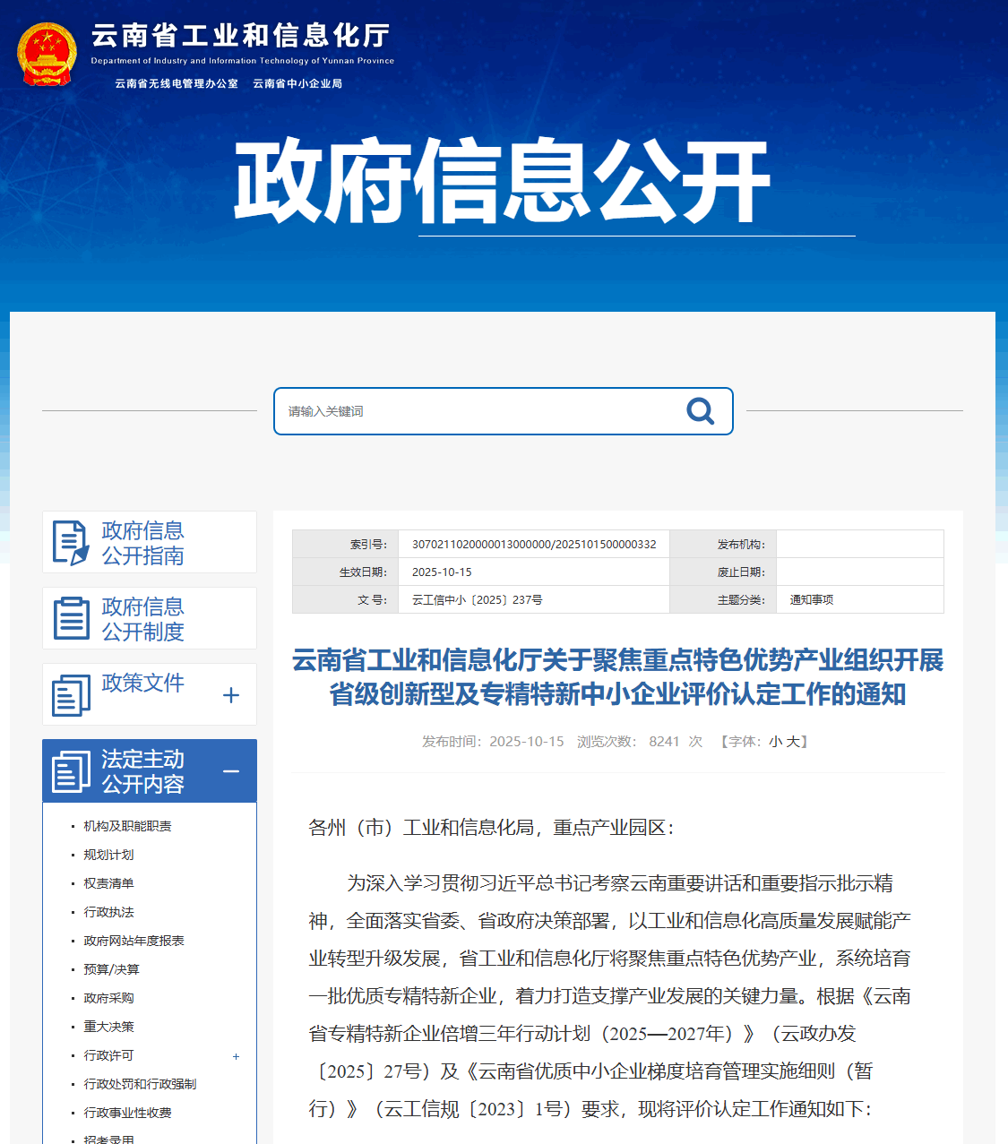 云南省工业和信息化厅近日发出《关于聚焦重点特色优势产业组织开展省级创新型及专精特新中小企业评价认定工作的通知》,聚焦云南省重点特色优势产业,系统培育一批优质专精特新企业,着力打造支撑产业发展的关键力量,以工业和信息化高质量发展赋能产业转型升级。